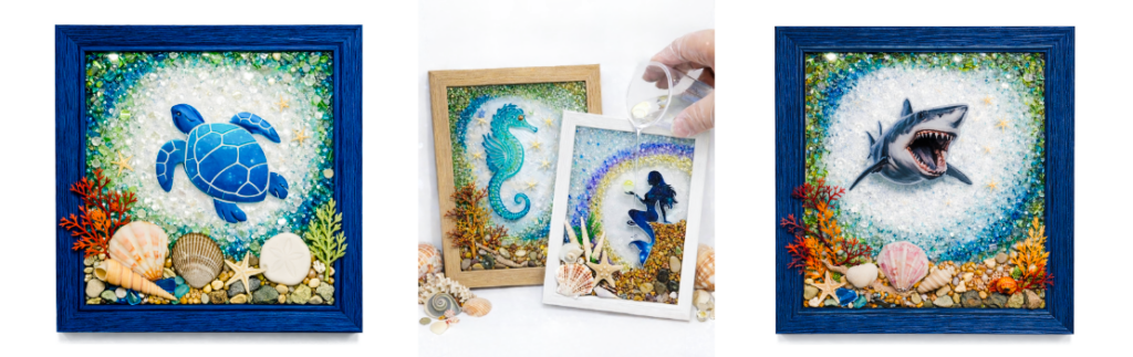 For the center, you can choose from a variety of vinyl stickers such as mermaids, turtles, seahorses, sharks, and more. Once your design is complete, you’ll pour epoxy resin over your artwork to give it a glossy, finished, and long-lasting look.